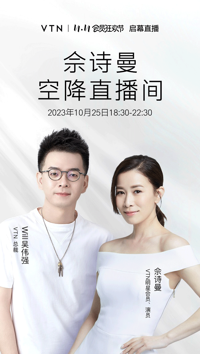 据悉,10月25日18:30,佘诗曼将空降VTN双11会员狂欢节启幕直播间,与VTN总裁Will 吴伟强一起分享健康生活方式和自我管理的秘诀,并将现场派发8888元幸运红包,豪送10台华为 Mate 60,7万件商品秒杀低至9.9元,更有VTN 6大爆款套组,买赠正装再加赠……狂撒福利,带来一场购物狂欢。