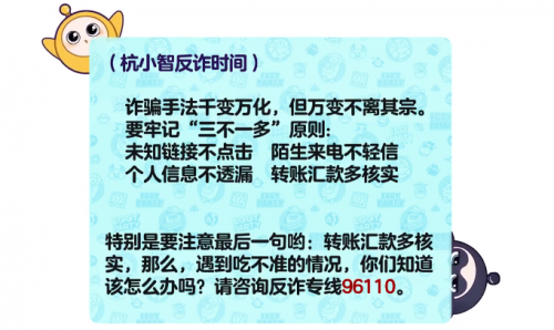 杭州市公安局反诈中心×《蛋仔派对》达成反诈宣传战略合作。牢记杭小智的“三不一多”原则,诈骗诡计慧眼辨。