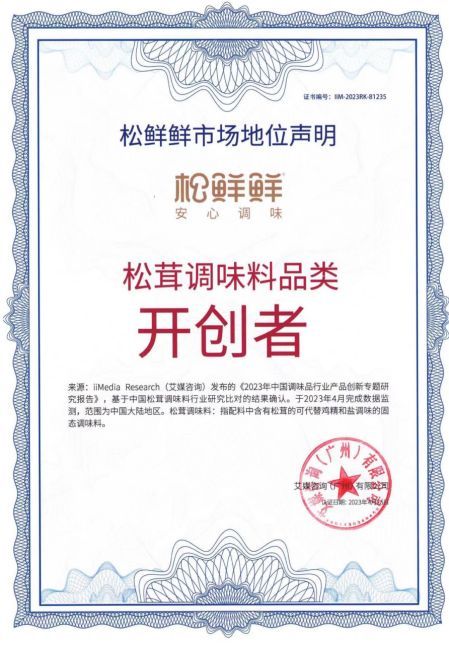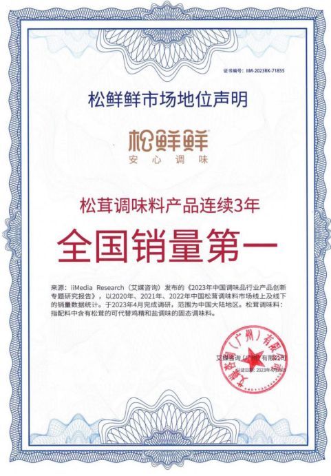 基于中国松茸调味料行业研究比对的结果与2020年-2022年中国松茸调味料市场线上及下线的销量数据统计确认,全球新经济产业第三方数据挖掘和分析机构iiMedia Research(艾媒咨询)授予松鲜鲜“松茸调味料品类开创者”与“松茸调味料产品连续三年全国销量第一”双料市场地位声明认证。