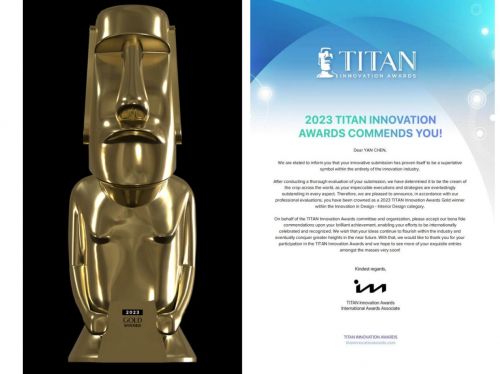 近日,陈燕女士收到一则国际喜讯:全球范围内最具权威的国际设计大奖之一——2023美国TITAN创新奖重磅公布了获奖名单,陈燕(YAN CHEN)在2023年泰坦创新奖第二季中获得国际认可! 国际奖项助理(IAA)自豪地透露,YAN CHEN凭借其惊人的作品赢得了冠军金奖。通过这个奖项,泰坦表彰了所有无畏的先驱者,执行大胆和富有想象力的想法,激发下一代有远见的人。