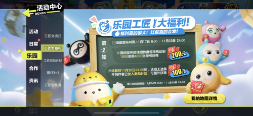 而「乐园工匠大福利」则主打不同主题下的「限时创作」,可以说是对用户创作能的极限挑战。比如 11 月的挑战要求玩家在规定时间内做图率先达到 1000 热度值的 4000 张地图的工匠,可获得 200 元红包大礼。