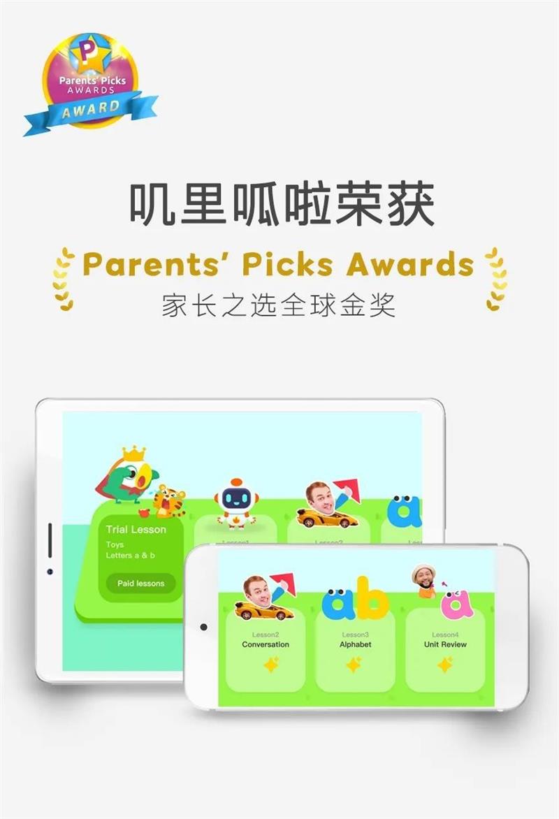 叽里呱啦获颁Parents' Picks Awards (家长之选全球金奖),与其匠心打磨的内容质量、有趣的互动体验,以及良好的用户口碑是密不可分的。