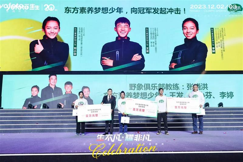 在积极促进中国肽营养行业发展的同时,三生也在持续通过公益的形式履行社会责任。为了让更多人感受到公益的力量,东方素养特别邀请深度公益合作伙伴——野象网球俱乐部主教练张晓洪以及俱乐部成员、东方素养梦想少年王发、李婷、刘小芬亲临盛典现场,将他们与东方素养的公益故事做现场分享。在盛典上,张晓洪教练和梦想少年们对三生在2023年给他们带来的鼎力支持表示了衷心感谢。
