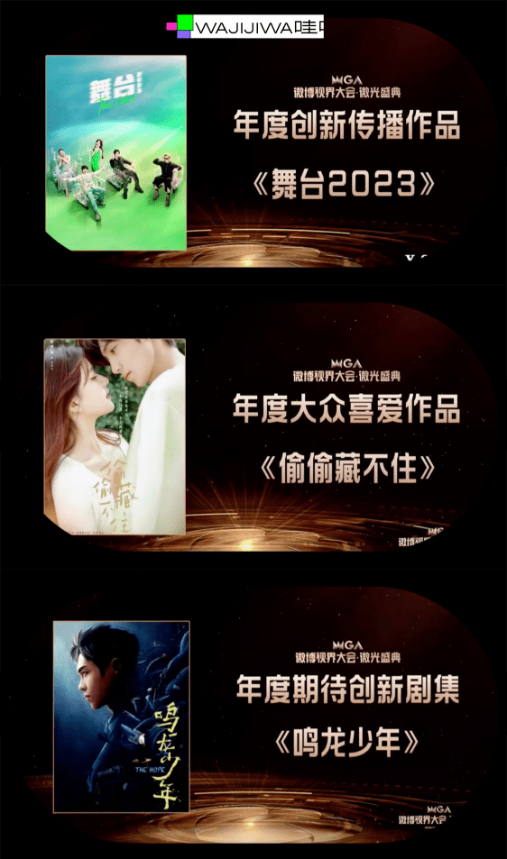 除了《鸣龙少年》的“年度期待创新剧集”荣耀外,今年由哇唧唧哇出品的另外两部作品也分别斩获奖项——《舞台2023》荣获“年度创新传播作品”荣耀,《偷偷藏不住》荣获“年度大众喜爱作品”荣耀。这三部电视剧及综艺,作为哇唧唧哇今年以来的内容创新作品,也见证了哇唧唧哇战略升级的初步成效。