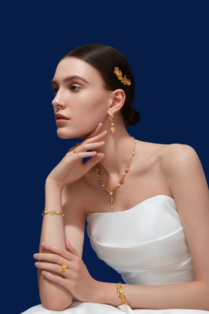 这套花嫁金系列有何独特之处?以桃金娘花环套系为例介绍。桃金娘花环套系融入具有美好寓意典故的元素设计,从象征着爱与祝福的桃金娘叶片汲取灵感,借用欧洲人们通常以桃金娘叶子的形状制成金灿灿的花环传递幸福的典故,将寓意幸运和忠诚、象征着爱情和婚姻的美好,且代表爱与祝福又见证了无数的真爱瞬间的桃金娘叶作为IP元素。在新春佳节将要到来的幸福时刻,复刻演绎出一套爱的佳作,独特的哑光工艺锻造出灵动叶片,圆润饱满的珍珠点缀其间,其金艺雕琢出繁复生长的叶片寓意生生不息,融和着对新的一年爱的永恒守护与对幸福不停追寻的美好期盼,诠释黄金的多元搭配,彰显优雅与灵动,凸显黄金新时尚的设计感,以新“叶”彰显新春新风采。