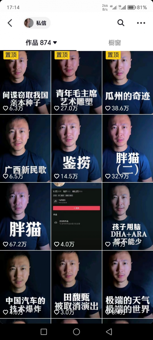 打开他的抖音,最新的视频,是《广西新民歌》、《鉴捞》和《胖猫(二)》。