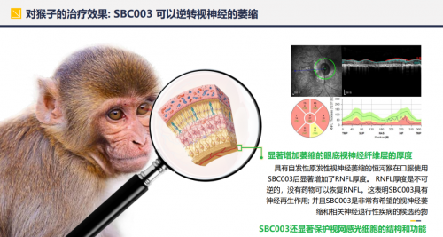 新药具有优异的神经修复功效,预期可以突破性地有效治疗视网膜神经退行性疾病。该团队首选视网膜色素变性(RP)作为新药研发突破口,目前已经完成了针对RP适应症的NMU毒素破坏小鼠感光细胞层的模型试验,rd10转基因小鼠模型试验。在这两个动物模型中,SBC003表现出优异的保护和逆转感光细胞凋亡的疗效。另外,该药物在猴子试验中表现出创造性的治疗视神经萎缩治疗效果,神经再生作用显著增加了萎缩的眼底视神经纤维层的厚度,并保护了视网感光细胞的结构和功能,预期SBC003对于RP适应症具有很好的疗效。