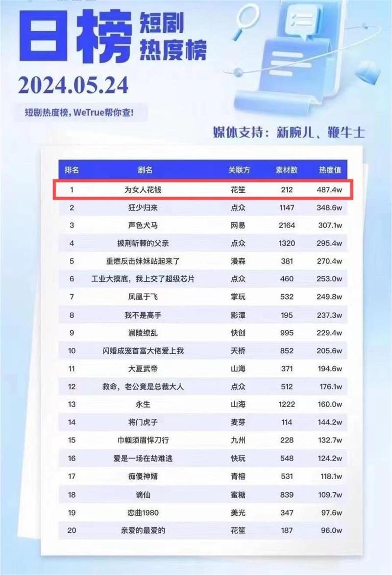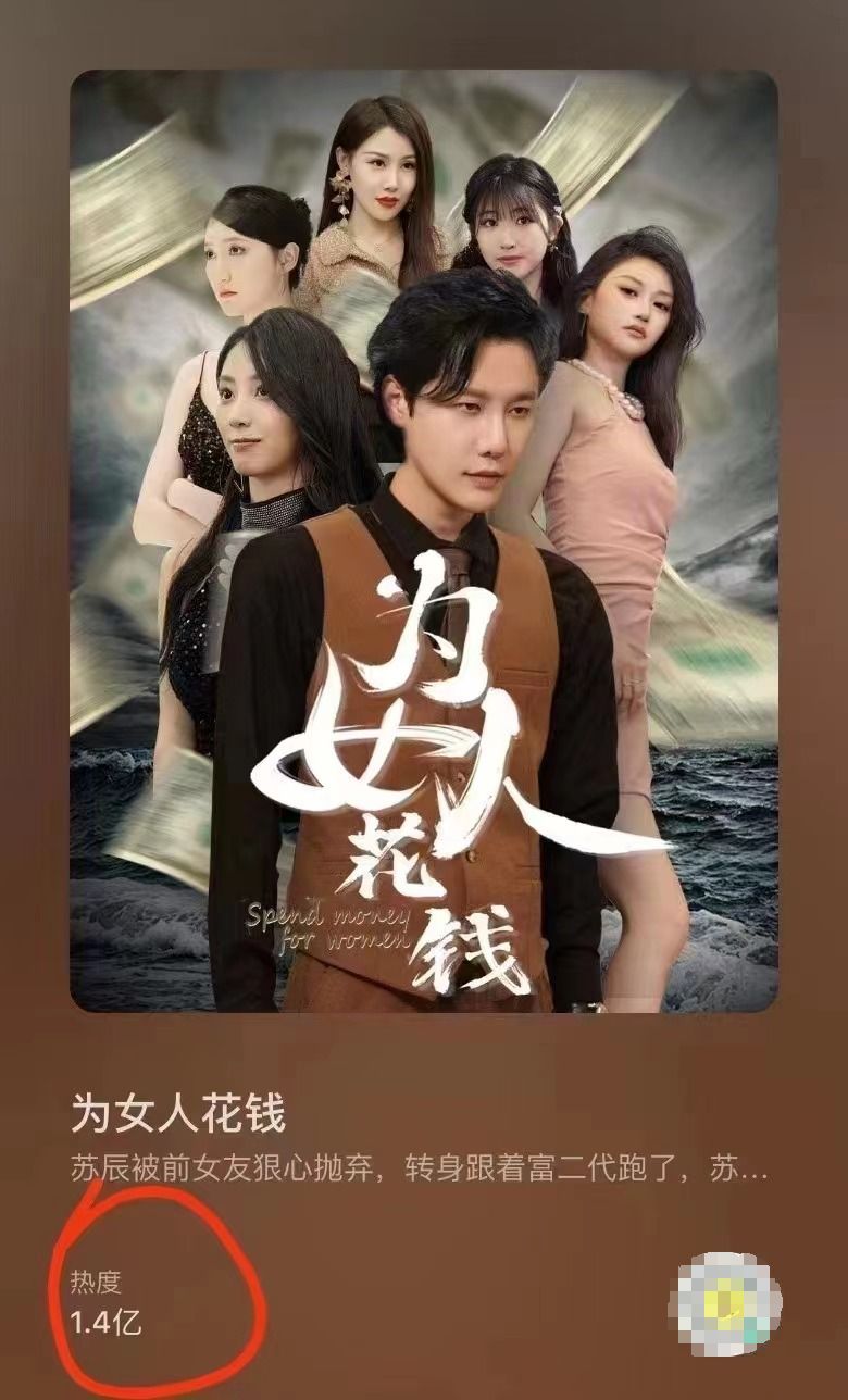 近日,短剧《为女人花钱》一经上线,于5月24日,直登短剧热度榜第一,大盘6799万。