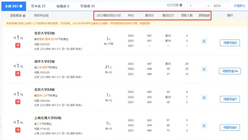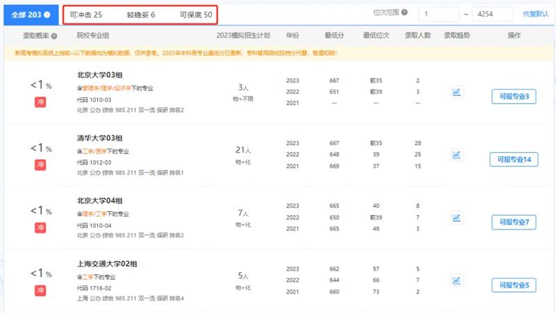 依托先进的大数据算法,系统还将根据“冲、稳、保”的梯度原则,为考生提供不同层次的志愿参考,并详细展示对应录取概率,助力每位考生都能制定出既科学又合理的志愿排序策略。