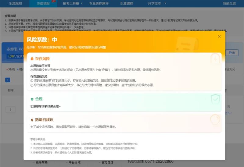同时提供志愿诊断功能,从志愿数量、志愿顺序、防滑档策略、防退档策略四大维度,为考生志愿表进行深入而全面的风险评估,最大限度地规避退档滑档的风险,给出调整建议。