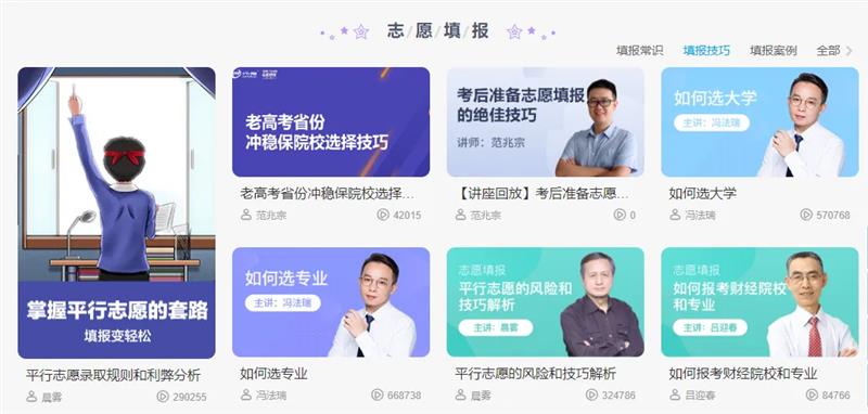 升学e网通精心打造了志愿填报系列专家课程,从填报基础知识、填报政策到填报技巧等多个维度,对志愿填报进行全面深入的解读,帮助家长和考生快速掌握志愿填报的核心要点,轻松上手。