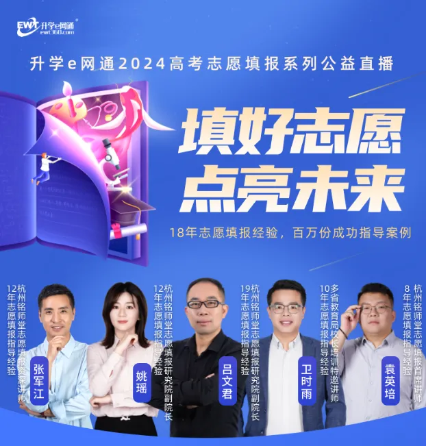 升学e网通于6月9日-26日为家长和考生们开启2024高考志愿填报系列公益直播!拥有18年志愿填报经验的专家团队,深入剖析报考政策、详细解读填报流程、传授实用方法技巧,针对报考过程中常见的问题给予专业解答。