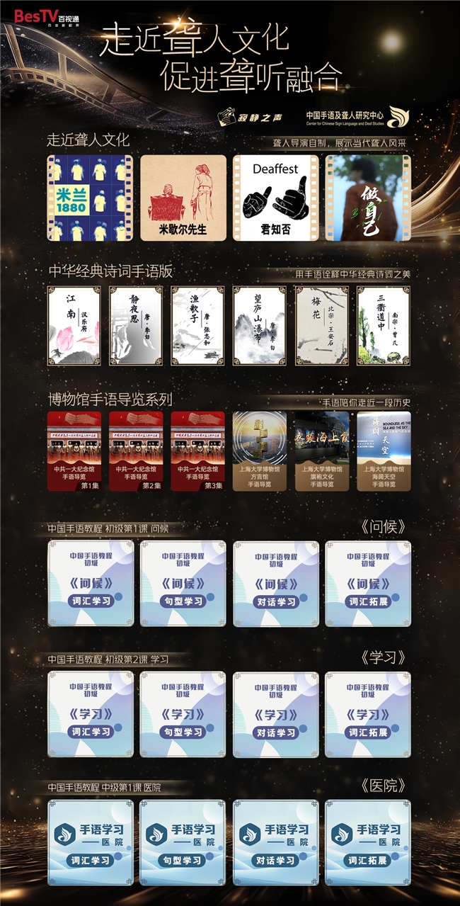 特别值得一提的是,这场展映将提供无障碍融合观影服务,现场将配置手语翻译,同步传达影片画面、字幕无法体现的“声音”,特别邀请听障人士共同参与“家门口的电视节” ,让这一光影盛节日惠及更多人群。百视通是“SMG无障碍文化艺术创作联盟”的一员,在志愿讲解、演出服务、技术支持、内容创作等多方面持续发力,为视、听障人群搭建一条线上视听盲道,享受光影艺术的魅力,感兴趣的朋友还可以来到电视市场展区,现场感受这项创新视听服务。在电视节举行期间,百视通还将限时展映多部由上海寂静之声文化传媒有限公司提供的聋人导演影片,以及由上海大学中国手语及聋人研究中心制作的《中华经典诗词手语版》、博物馆手语导览系列、《中国手语教程》等内容,与视听障人士一起过节,畅享光影魅力,感受城市温度。