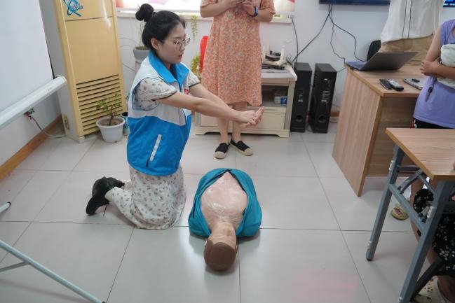 在实践中,队员张梦雪、程彦鹏、赵旭阳向居民进行了海姆立克急救法和心肺复苏术的宣讲和演示。针对不同的情况,队员们都进行了详细的分步讲解,重点讲解了按压位置、操作位置等基本要领。同时,队员们还利用心肺复苏模型邀请居民进行了实地操作并一对一地指导纠正动作。通过互动体验、上手操作、动作纠正,居民们积极参与、认真聆听,更加生动深刻地掌握了应急救护的操作。