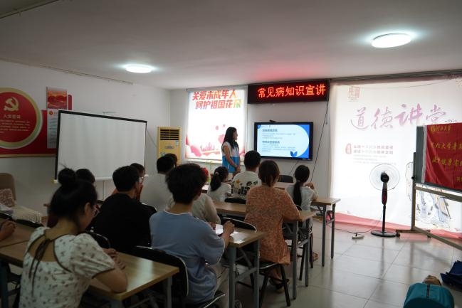 针对当前中老年人部分疾病较为多发的情况,实践团队在前期问卷调查及走访的基础上,就相关中老年人常见疾病预防与控制进行宣讲。队员王晶主要对如何预防糖尿病和高血压进行详细讲解,郭梓楠从如何控制冠心病和卒中开展宣讲,刘佳昕为居民们普及心脑血管疾病的有关知识并进行老年人如何进行健康运动宣讲。