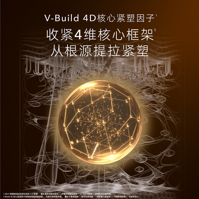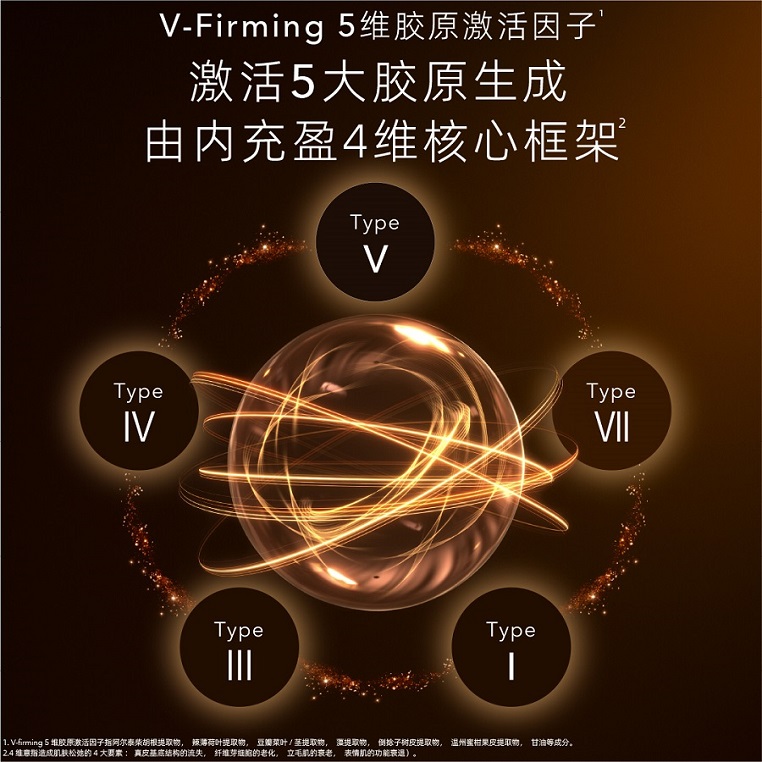 搭载独特成分V-Build 4D核心紧塑因子,重建肌肤核心四维框架,令面部轮廓紧致提拉;亦融蕴全新成分V-Firming 5维胶原激活因子,同时激活五种胶原蛋白,令肌肤充盈有弹力。