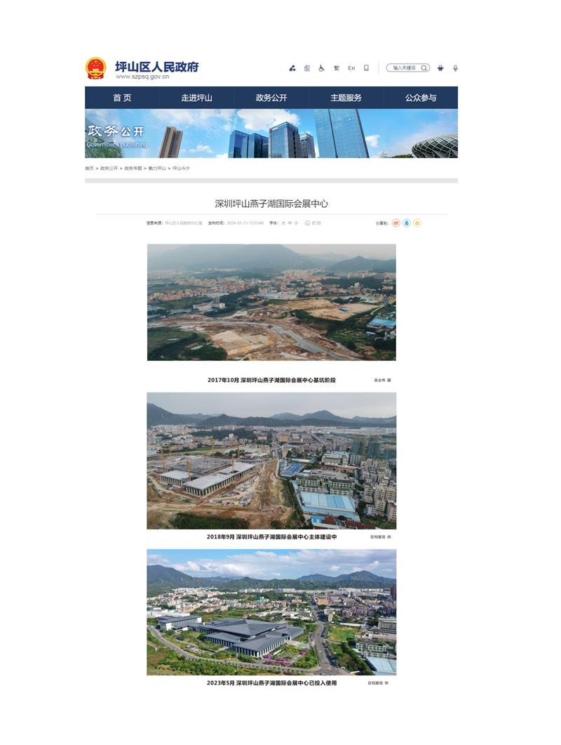 深圳市坪山区人民政府官网发布:2024年5月15日发布,深圳市坪山区人民政府发布了深圳坪山燕子湖国际会展中心的建设情况,2017年10月,深圳坪山燕子湖国际会展中心处在基坑阶段,2018年9月深圳坪山燕子湖国际会展中心主体展馆在建设中,2023年5月,深圳坪山燕子湖国际会展中心正式投入使用。