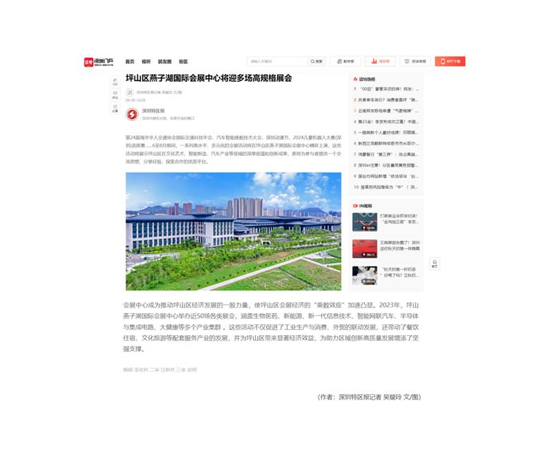 深圳市委机关报《深圳特区报》2024年6月6日发布:深圳坪山燕子湖国际会展中心成为推动坪山区经济发展的一股力量,使坪山区会展经济的“乘数效应”加速凸显。2023年,深圳坪山燕子湖国际会展中心举办近50场各类展会,涵盖生物医药、新能源、新一代信息技术、智能网联汽车、半导体与集成电路、大健康等多个产业集群 。这些活动不仅促进了工业生产与消费、外贸的联动发展,还带动了餐饮住宿、文化旅游等配套服务产业的发展,并为坪山区带来显著经济效益,为助力区域创新高质量发展增添了坚强支撑。
