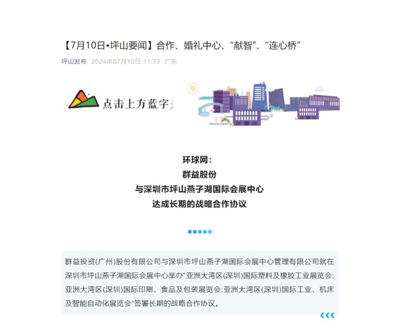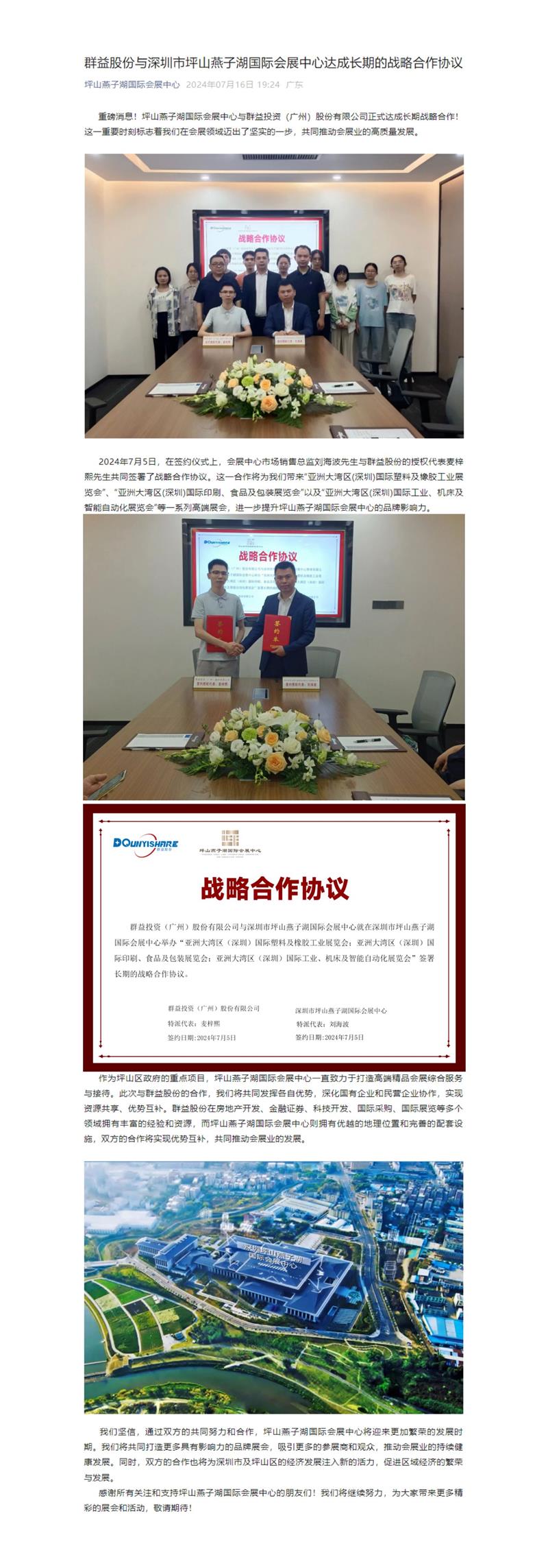 深圳市坪山区人民政府微信公众号2024年7月10日发布:群益投资(广州)股份有限公司与深圳市坪山燕子湖国际会展中心管理有限公司就在深圳市坪山燕子湖国际会展中心举办“亚洲大湾区(深圳)国际塑料及橡胶工业展览会;亚洲大湾区(深圳)国际印刷、食品及包装展览会;亚洲大湾区(深圳)国际工业、机床及智能自动化展览会”签署长期的战略合作协议。