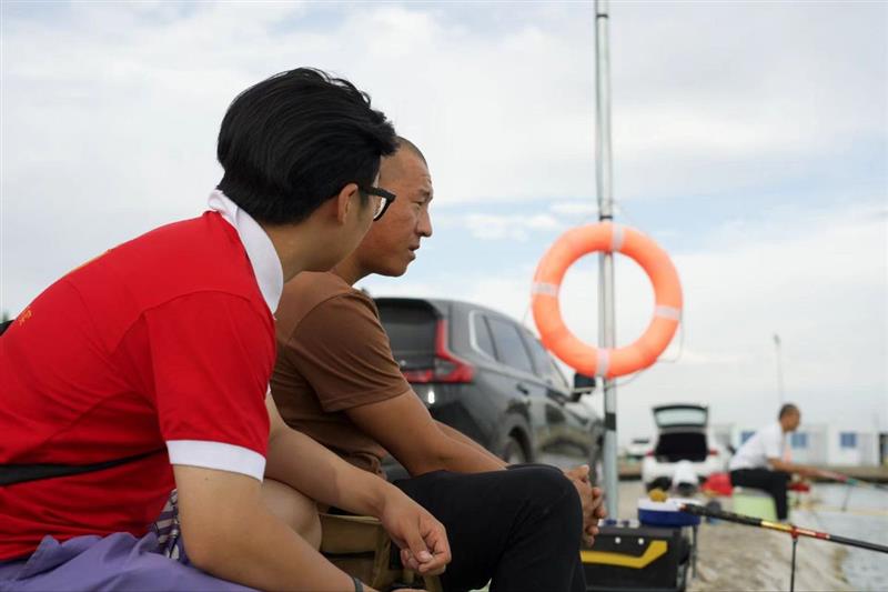 (图为实践团成员与钓鱼的顾客探讨鱼情。)