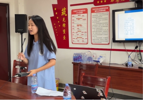 随后,团队成员利用现代化新媒体技术,通过播放提前制作好的“一分钟告诉我们为什么要学习国家通用语言”短视频的播放向村民们展现了普通话在帮助个人成长、助力乡村振兴等各个方面的积极作用,大大激发了村民对普通话学习的热情;随后三位队员伴随着激昂的背景音乐,深情朗诵着《中国话》的篇章,“有一种语言,蕴含着一个民族上下几千年悲喜交加的情感”话语铿锵有力,抑扬顿挫之间尽显普通话的魅力,坚定的声音表达出了对于推广普通话未来的美好憧憬以及对于自身责任的深刻理解;团队成员也通过“看图猜古诗”、“绕口令”和“你说我猜”等有趣多样的互动游戏寓教于乐,孩子们怀着兴奋而好奇的心情,积极参与各项小游戏;“便宜一点叫巧一点,钥匙叫锁爬子,头发叫头毛”借用趣味横生的方言与普通话的联动也成功引发了教室内小朋友们清脆的笑声,实践团队成员们通过生动的讲解和互动,让同学们在参与过程中感受中华文化的博大精深,激发他们对普通话学习的兴趣,课堂上一片欢声乐语。