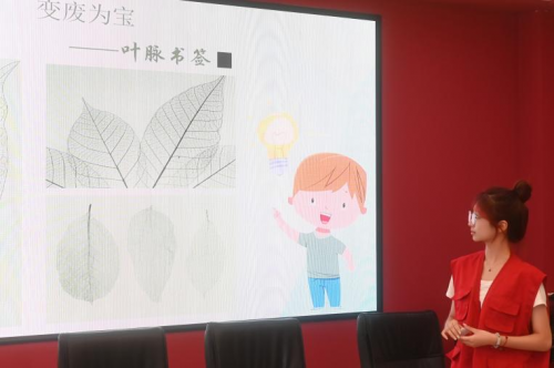 时伟景同学在为小朋友们讲解如何回收落叶制作叶脉书签·骆守骞供图