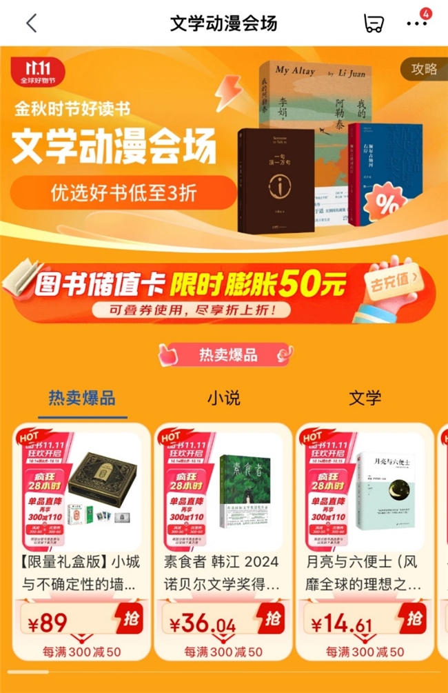 日前,韩国女作家韩江获得了2024年诺贝尔文学奖,其作品在京东搜索量直线上升。在11.11活动期间,读者可以进入“文学动漫会场”,以最低折扣入手这位新晋诺贝尔文学奖作家最负盛名的《素食者》《不做告别》《植物妻子》等作品,感受其“用强烈的诗意散文直面历史创伤,揭示人类生命的脆弱”的文学魅力。同时,读者在该会场还将邂逅莫言、刘震云、梁实秋等著名作家的经典著作。