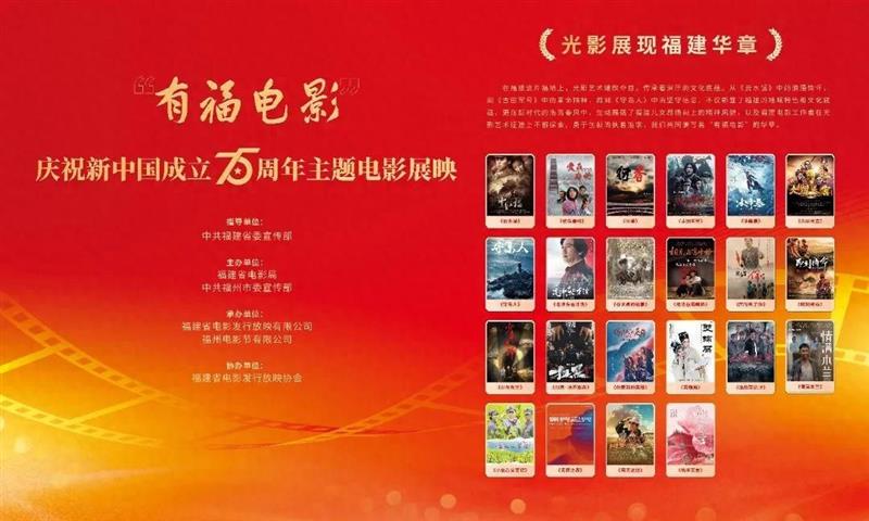 由福建省电影局、中共福州市委宣传部主办,福建省电影发行放映有限公司、福州电影节有限公司承办的“有福电影”庆祝新中国成立75周年主题电影展映正式开启。《中国乒乓之绝地反击》《你是我的英雄》《扫黑·决不放弃》《古田军号》《即刻待命》《小宝心从军记》等多部福建出品的电影于2024年10月在全省九市一区20家影院进行公益展映。