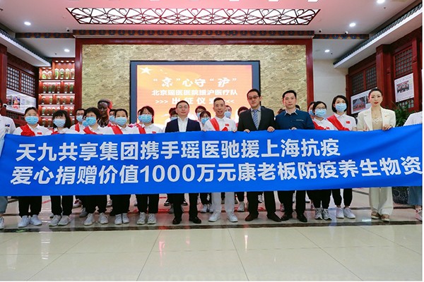 当前上海正处于疫情防控的攻坚时刻,天九共享集团决定携手瑶医,驰援上海,助力抗疫。4月25日,天九共享集团联手北京瑶医医院举办的“京”心守“沪”援沪医疗队出征仪式暨天九共享集团爱心捐赠仪式在北京举行。天九共享集团捐赠了价值1000万元的“康老板”全场景防疫养生物资,将陆续随同医疗队紧急开赴上海,与疫区人民同舟共济、共克时艰。