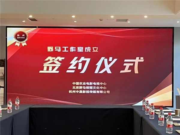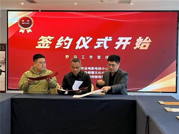 2023年11月22日上午,中国农业电影电视中心、北京野马部落文化中心、杭州中晟影视传媒有限公司三方代表在杭州钱江世纪城开元名庭酒店钱江厅举行了野马工作室成立签约仪式。本次签约仪式的成功举行,标志着合作三方将在保护野生动物宣传领域展开深入合作。这一合作不仅有助于传播中华民族对生态文明建设的重视,也将进一步彰显对野生动物保护所做出的贡献。我们将充分利用各自的影视媒介平台优势,积极传播正能量信息,呼吁更多的群体关注和参与环境保护事业,通过共同努力,实现可持续发展的目标。
