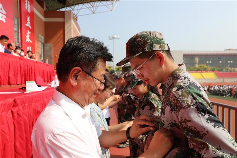 随后,校领导为2023级新生代表佩戴学校校徽,台下同学集体佩戴校徽。党委副书记、副校长巩守平宣读《关于做好2023级本科新生军训工作的通知》。研究生新生代表张雅楠带领2023级新生进行了庄严的《医学生誓言》宣誓。