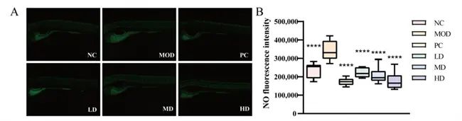 一氧化氮(NO)是肠道内的抑制性神经递质,过量合成会直接导致肠道蠕动迟缓,是便秘发生的重要诱因。BGI-N2能剂量依赖性降低便秘斑马鱼肠道的NO浓度,解除NO对肠道平滑肌的抑制作用,让肠道动力恢复正常。