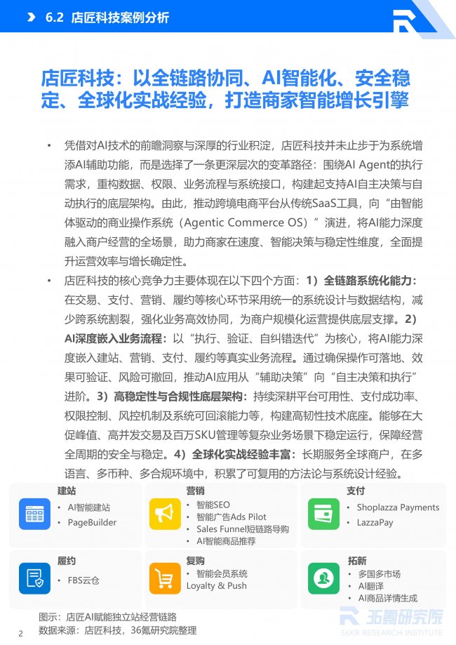 36 氪研究院在报告中指出,未来十年的电商平台,很可能不再只是 SaaS 工具,而是能够承载智能体持续运行的商业基础设施。而以店匠科技为代表的 Agentic Commerce 平台实践,正为这一趋势提供重要参考。