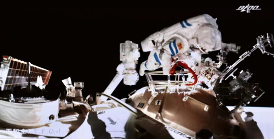 航天员刘伯明身着新一代“飞天”舱外服出舱。