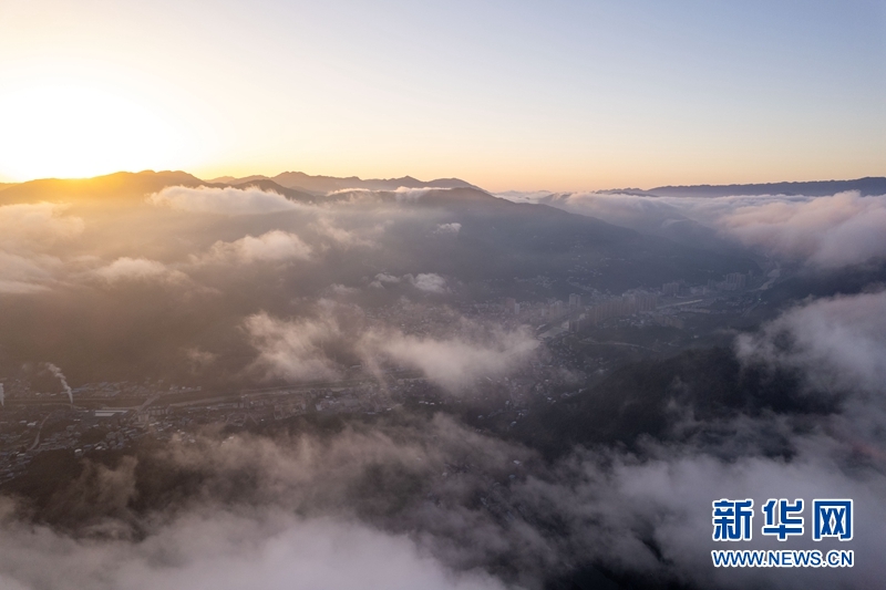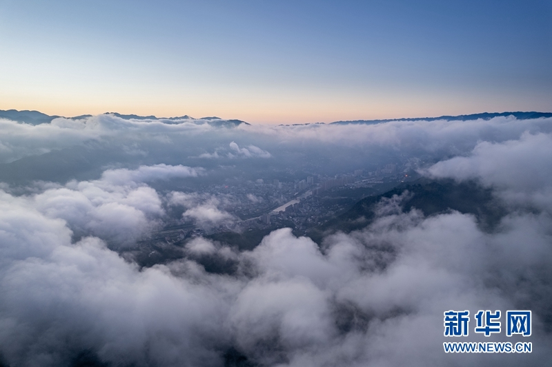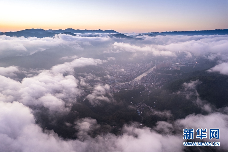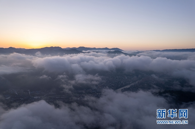 近日,湖北省襄阳市保康县出现云海景观,县城四周群山和山村在云雾中若隐若现,仿佛“天空之城”,美若仙境。(赵梦琪)