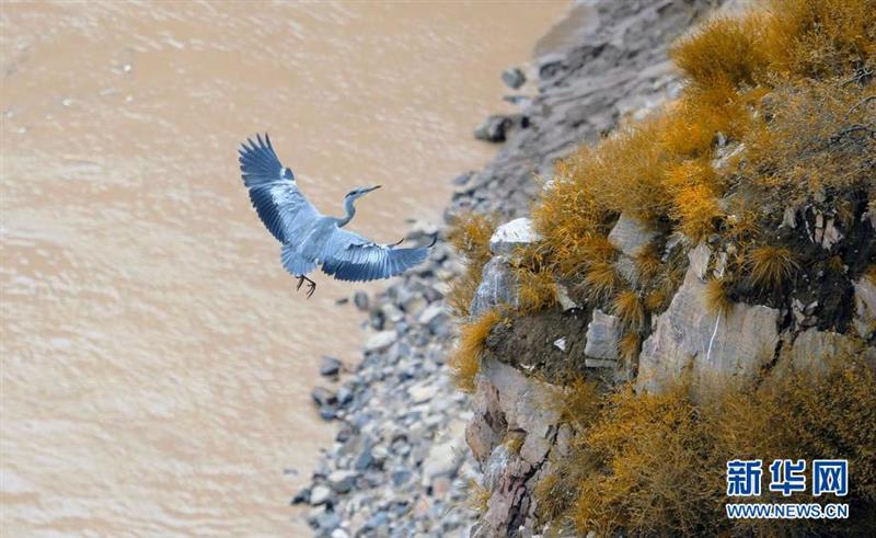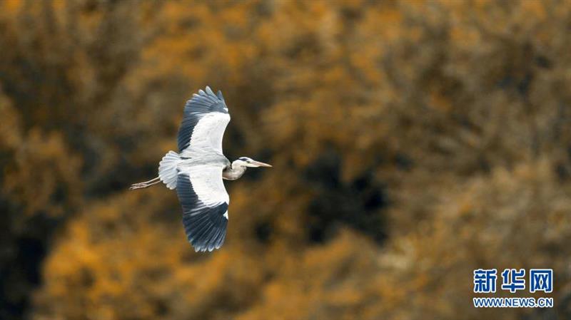 黄河岸边,一只苍鹭展翅飞翔。新华网 发