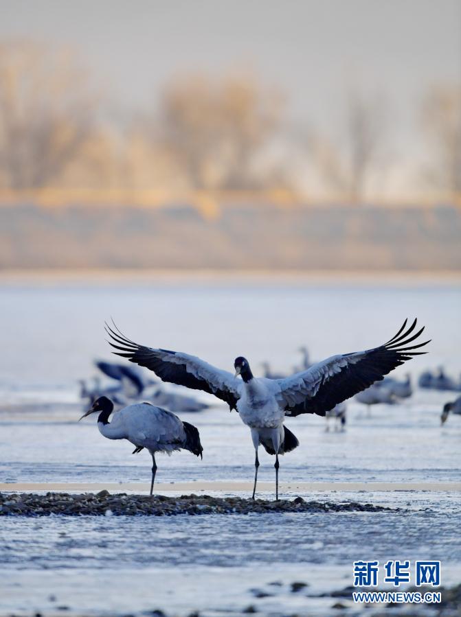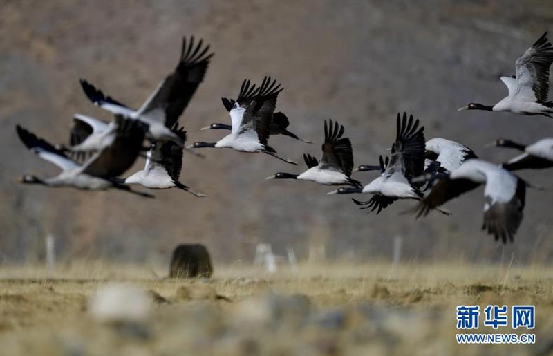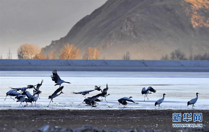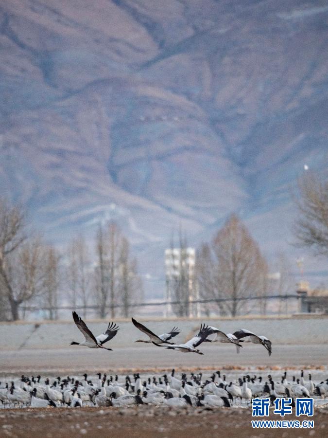 冬日,大批黑颈鹤在西藏拉萨市林周县境内栖息、觅食。 林周县黑颈鹤自然保护区建立于1993年,2003年被设立为国家级自然保护区,是雅鲁藏布江中游自然保护区的核心部分,在每年的11月底至12月初,这里便会迎来成群的黑颈鹤过冬。