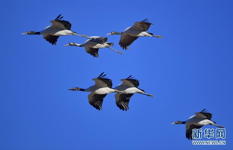 黑颈鹤在自然保护区上空飞翔(2021年1月3日摄)。