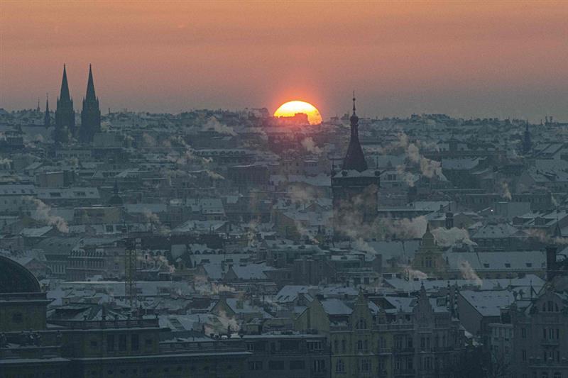 2月12日在捷克布拉格拍摄的日出。新华社/法新