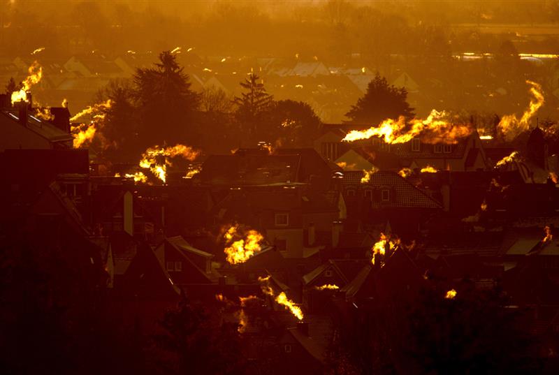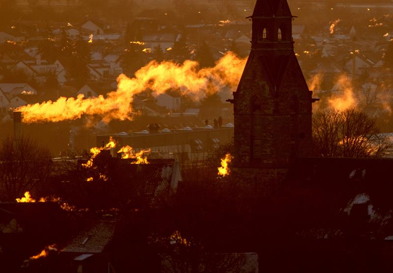 2月13日在德国克龙贝格拍摄的日出时分建筑上升起的烟雾。新华社/美联