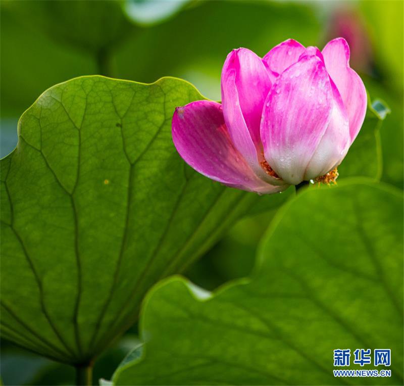 当日,安徽省淮北市一场夏雨把盛开的荷花冲刷的娇艳迷人,荷叶层层叠叠、清香袭人,荷花次第开放,吸引了许多市民前来游园观赏。新华网发(王文 摄)