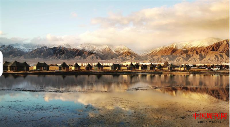 察尔汗盐湖的湖底是结晶的盐花和盐盖,雪白晶莹,似冰似雪,盐盖上覆盖着没脚踝深的水,映着天光,呈现出碧绿浅绿湛蓝浅黄雪白等五彩颜色,水清见底,晶莹透彻。盐湖也很安静。天气很好,阳光照射在湖面上,水面静静地透射出五彩的光,游客的喧闹声都影响不了它的静,笑闹声瞬间消散在风中。除了游人喧闹,没有其他任何声音,可以想象,待游人散去,这里只有水、风和空气中咸咸的气息,湖面上正在建设的星空房倒真似外星人的城堡,那种恍若隔世的感觉会在星空下蔓延。