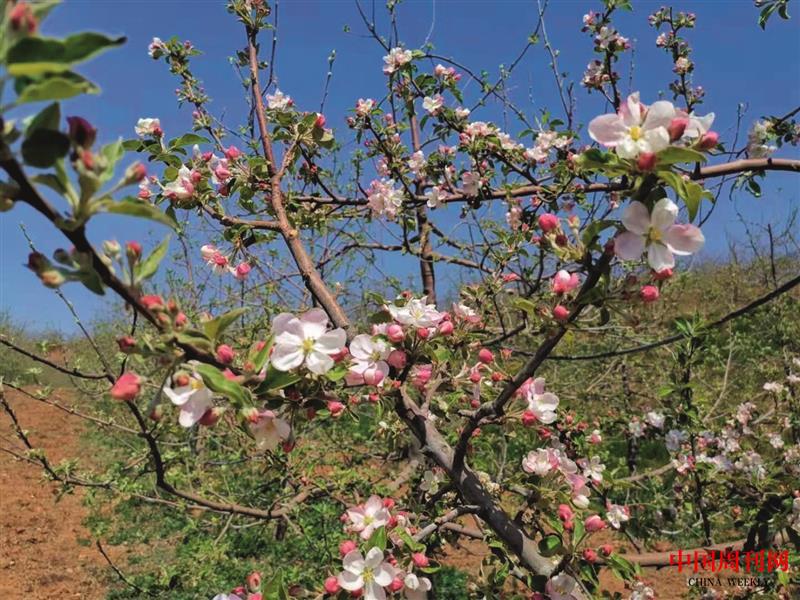 上戈苹果是洛宁的一张名片,第年四月这里的苹果花满山遍野,图为上戈苹果花。