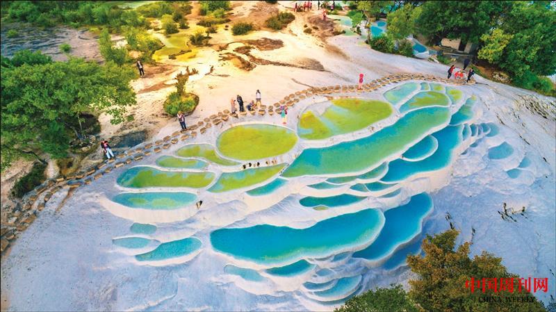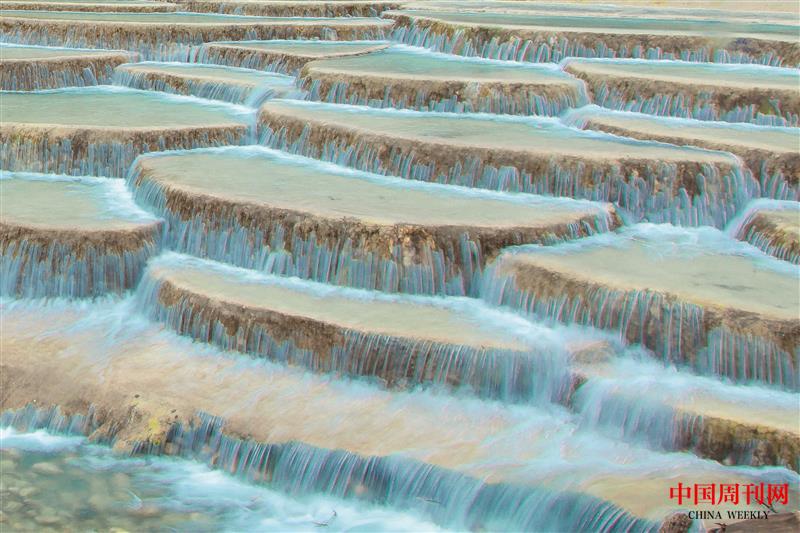 渐走渐近,渐近渐清。晶莹耀眼的银屏,似千百台迭起的琼台玉阶,又像千百道云波雪浪,自下而上,一台台,一层层,堆云凝雪,纯白如脂,莹润如玉,纤尘不染。台面上,有的如鳞细波,曲折有致;有的如银环滚动,连环相扣;有的如绢扇平铺,折痕四射;有的如花瓣相拼,形成各种奇花异卉;有的如大小梯田,叠层而起。左侧,有道20来米高的“飞瀑”;底下,有个三四百平方的月牙形泉台,泉水清冽澄碧,泉中有一天然塑像,宛如少女在泉边照影,披纱裹素,清秀俏丽,当地群众呼为“神女”。台中央的华泉小洲,宛如一弯新月,水从其中滑过;珠光闪烁,奇丽无比。