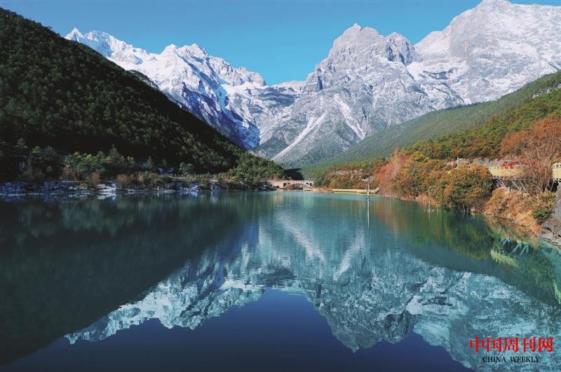 蓝月谷不是很大,沿着岸边长廊缓步前行,在蓝月湖中心有一小片的砂砾和枯木露出水面,石头是奶白色的,映得水面也成了奶白色。在湖泊的对岸还没有设置防护设施,只有一条石道,这时要多加小心注意安全,虽然看着水很浅,其实还是较深的。而抬头的不经意间,巍峨壮丽的玉龙雪山便出现在了眼前。
