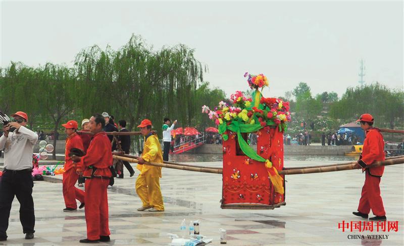 与洛阳纯粹赏花不同的是,菏泽几个牡丹园内,或者是街边、道边不时有女性花农售卖从自家地里采摘的新鲜牡丹花朵,现场牵接在新绿的柳枝上,一副牡丹花冠即刻做成。花朵也是红白紫黑搭配,戴在女士们的秀发上,芳香袭人,雍容华美,不禁让人联想到唐代簪花仕女图的现实版本。