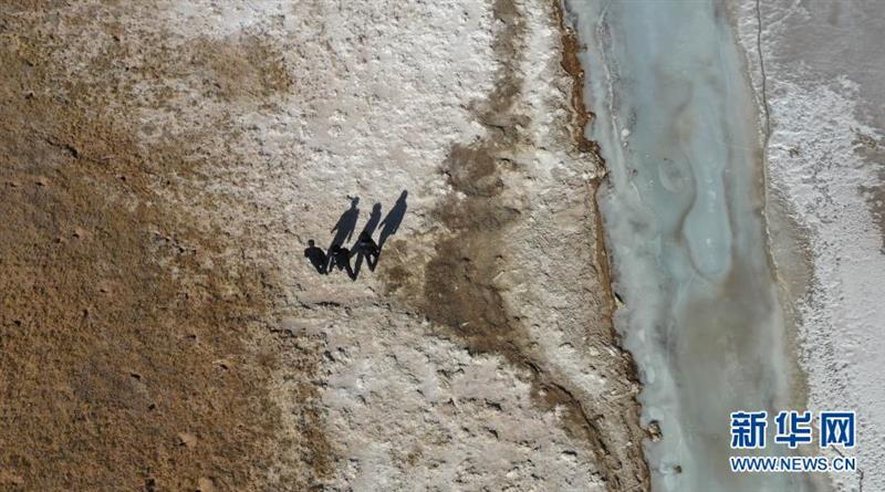 12月7日,站长赵新录(中)与队友邓海平(左)、达才在可可西里索南达杰保护站管护区域内巡查(无人机照片)。