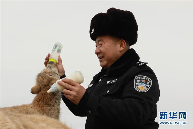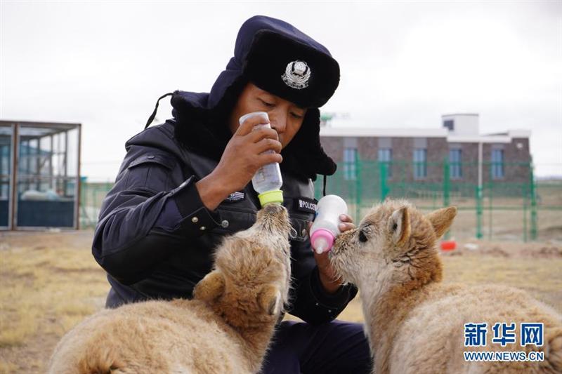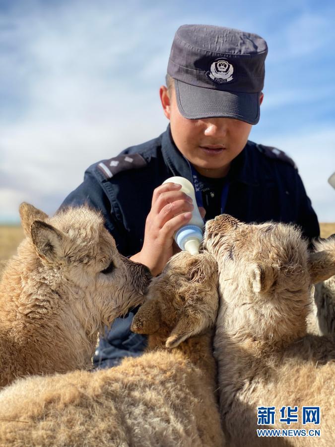 12月7日,可可西里巡山队员达才在给藏羚羊幼仔喂奶。
