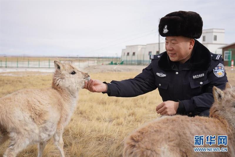 12月7日,可可西里索南达杰保护站站长赵新录在给藏羚羊幼仔喂奶。
