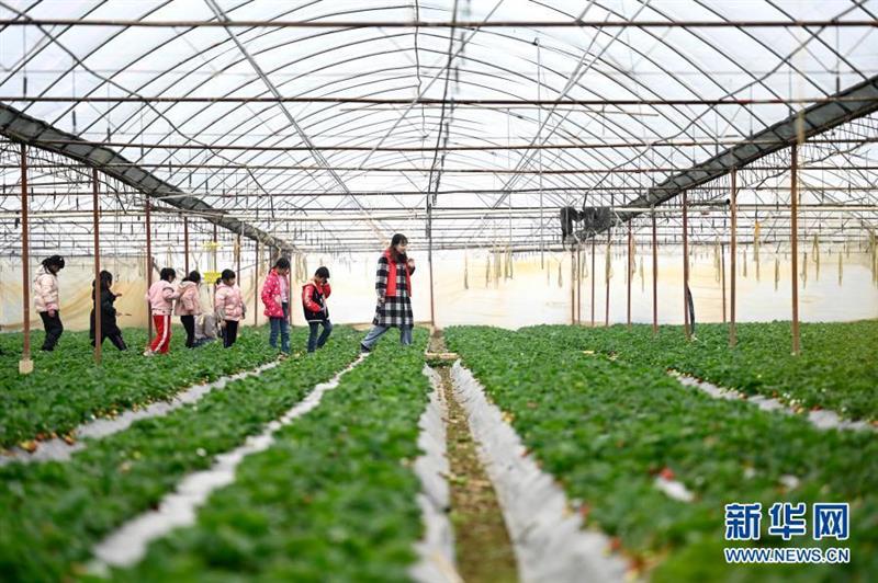 12月27日,在广西柳州市柳江区进德镇龙新村,志愿者带着村里的小朋友走进大棚学习农业知识。